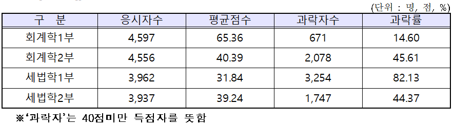 회계학 1부와 2부는 지난해보다 쉽게 출제되며 과락률도 낮아지고 평균점수도 상승했습니다.
