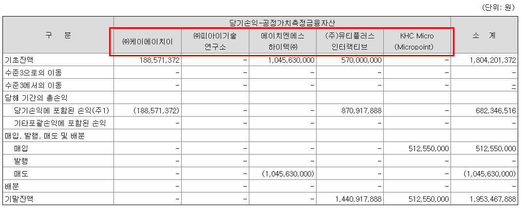 고유계정 투자 수익인 가티의 영업수익은 다음과 같이 공정가치측정금융자산평가이익과 공정가치측정금융자산처분이익으로 구성됩니다. 회계상 언어가 복잡해 보이지만 단순히 에이티넘인베스트가 직접 투자한 회사의 가치를 공정가치로 평가한 손익과 당기 중에 처분에 따른 손익이라고 이해하시면 됩니다. 에이티넘인베스트는 유티플러스인터랙티브 등에 직접 투자를 했고 이에 대한 평가 손익을 반영하고 있는 것입니다.