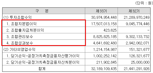 투자조합수익은 다음과 같이 조합지분법이익과 조합출자금처분이익, 조합관리보수, 조합성과보수로 구성됩니다.