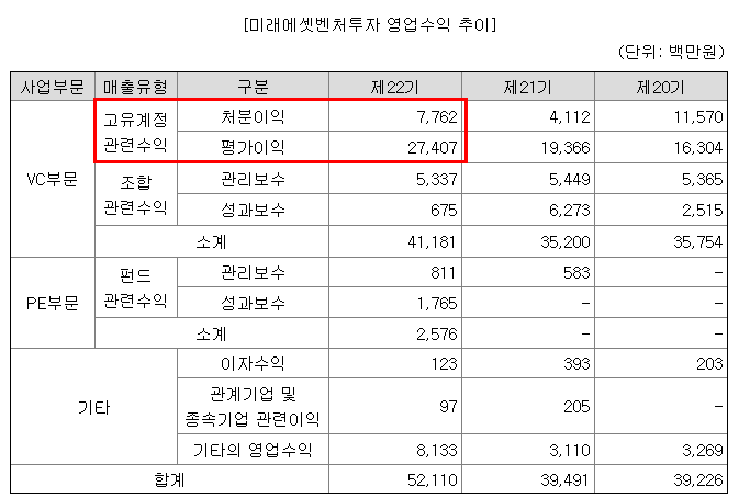 창투사가 자기 자본을 활용하여 벤처기업 등에 직접 투자하는 경우 투자 손익(평가손익, 처분손익)이 발생합니다. 고유 계정 투자에 따른 투자 손익은 조합 투자로부터 인식하는 수익에 비해 창투사의 손익에 미치는 영향이 큰 편입니다.