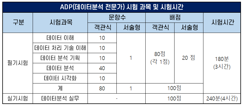 ADP 필기시험 과목은 ① 데이터 이해, ② 데이터 처리 기술 이해, ③ 데이터 분석 기획, ④ 데이터 분석, ⑤ 데이터 시각화의 5개 과목이며, 실기시험은 데이터 분석 실무를 시험과목으로 합니다.