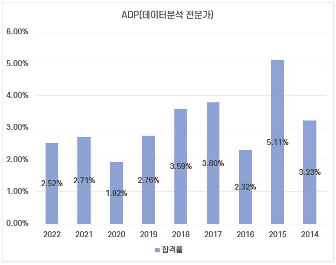 2021년에는 2,436명의 ADP 시험 응시자 중 66명이 합격해 2.71%의 합격률을 기록했고, 역대 가장 많은 인원이 응시한 2022년에는 2,737명이 ADP 시험에 응시했으나 69명이 합격해 2.52%의 합격률을 보였습니다.