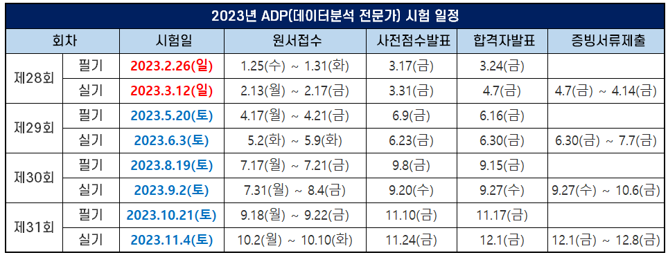 ADP 시험은 필기시험과 실기시험 모두 1년에 4번 시험이 시행됩니다. 2023년에는 제28회 데이터 분석 전문가 시험부터 제31회까지 시험이 시행되는데요. 그 일정은 아래 표와 같습니다.