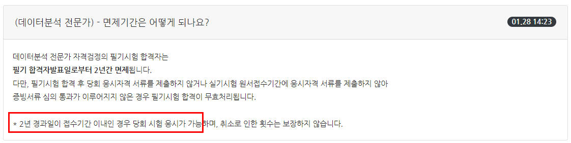 필기시험에 합격한 자만이 실기시험에 응시할 수 있는데요. 필기시험은 합격자 발표일로부터 2년의 유효기간을 갖기 때문에 필기시험 합격자는 2년 동안 실기시험이 면제되며 필기시험 합격일로부터 2년 내에 원서접수가 가능한 실기시험에 응시 가능합니다. 예를 들어 제25회 데이터 분석 전문가 필기시험 합격자는 합격자 발표일인 2022년 3월 25일 이후 2024년 3월 25일 전에 원서접수가 가능한 실기시험에 계속 응시 가능합니다.