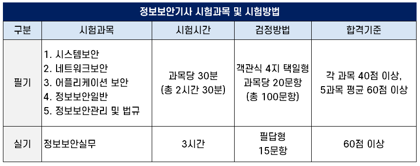 | 필기 | 1. 시스템보안 2.네트워크보안 3.어플리케이션보안 4.정보보안일반 5.정보보안관리및법규 |