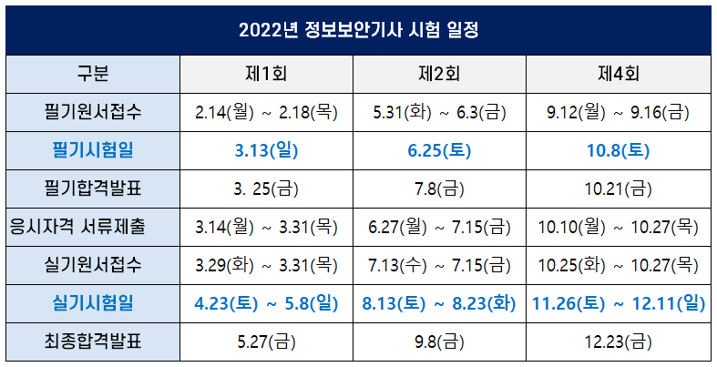 한국방송통신전파진흥원이 시행하는 국가기술자격시험은 매년 1회부터 4회까지 총 4번의 필기 및 실기시험을 시행하는데요. 정보보안기사는 2022년 1회, 2회, 4회 차 시험 일정에 따라 필기시험과 실기시험을 시행합니다. 각 회차별 2022년 정보보안기사 필기 및 실기 시험 일정은 어떻게 되는지 지금부터 살펴보도록 하겠습니다.