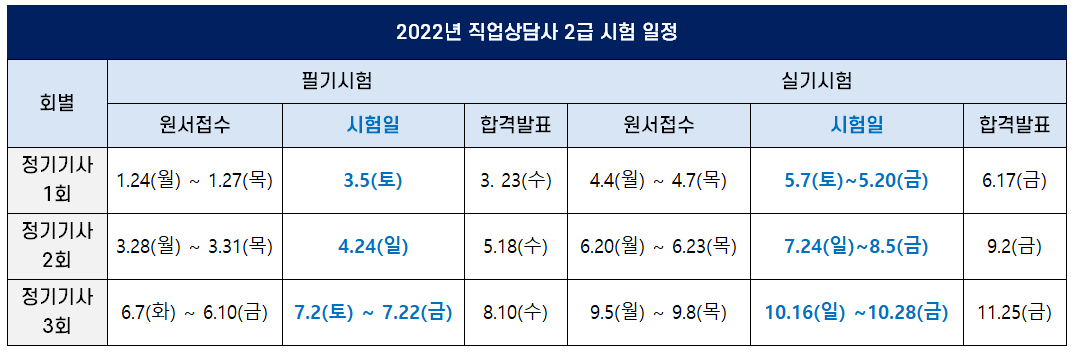 한국산업인력공단이 자격시험을 시행하는 직업상담사 2급은 정기 기사 1회, 2회, 3회 차 시험 일정에 따라 필기시험과 실기시험을 시행하는데요. 2021년에 시행된 직업상담사 2급 1회, 2회, 3회 필