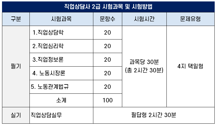 | 필기 | 1.직업상담학 | 20 | 과목당 30분 (총2시간30분) |