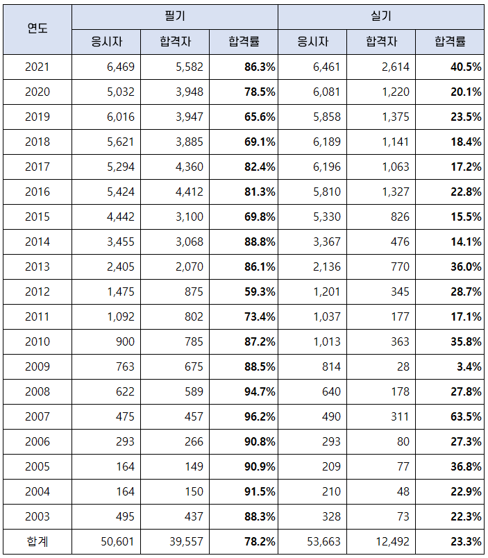 임상심리사 2급 자격시험이 처음 시행된 2003년부터 2021년까지 필기 및 실기 합격률은 아래 표와 같습니다.