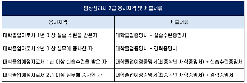 임상심리와 관련한 실습 수련을 1년 이상 받은 자 또는 2년 이상 실무에 종사한 자로서 대학 졸업자 및 졸업예정자 등에게 임상심리사 2급 응시자격이 주어지는데요. 아래 표의 4가지 조건 중 하나를 충족해야 임상심리사 2급 자격시험에 응시할 수 있습니다.