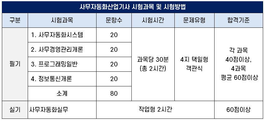 사무자동화산업기사 시험과목 및 시험 방법