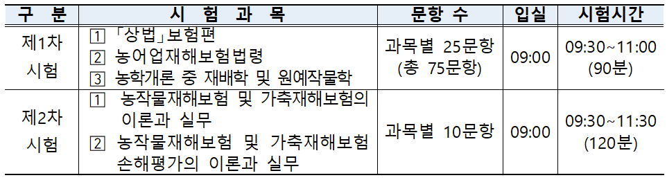 1. 「상법」보험편 2. 농어업재해보험법령 3. 농학개론 중 재배학 및 원예작물학 |