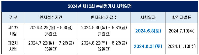 2024년 손해평가사 1차 시험은 6월 8일 토요일에, 2차 시험은 8월 32일 토요일에 시행되고, 원서접수기간 및 합격자 발표일은 다음과 같습니다.