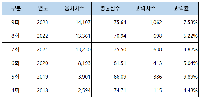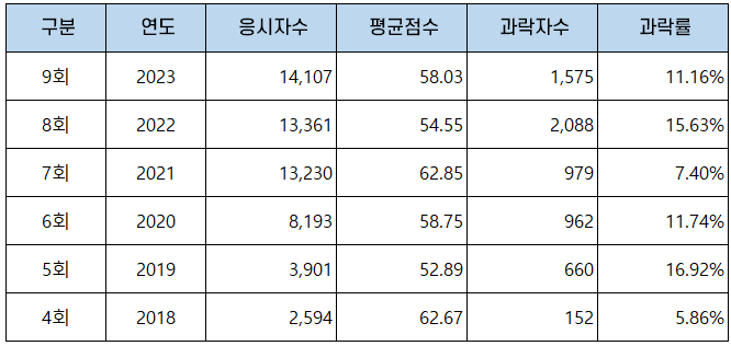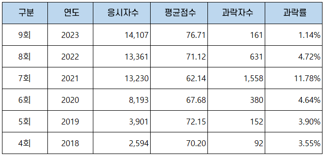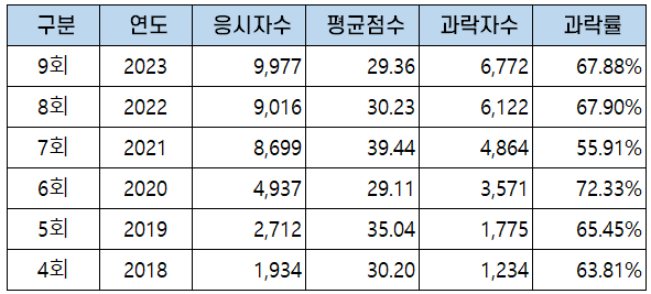 | 구분 | 연도 | 응시자수 | 평균점수 | 과락자수 | 과락률 |