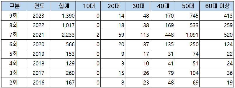 | 7회 | 2021 | 2,233 | 2 | 59 | 113 | 448 | 1,091 | 520 |