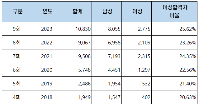| 구분 | 연도 | 합계 | 남성 | 여성 | 여성합격자 비율 |