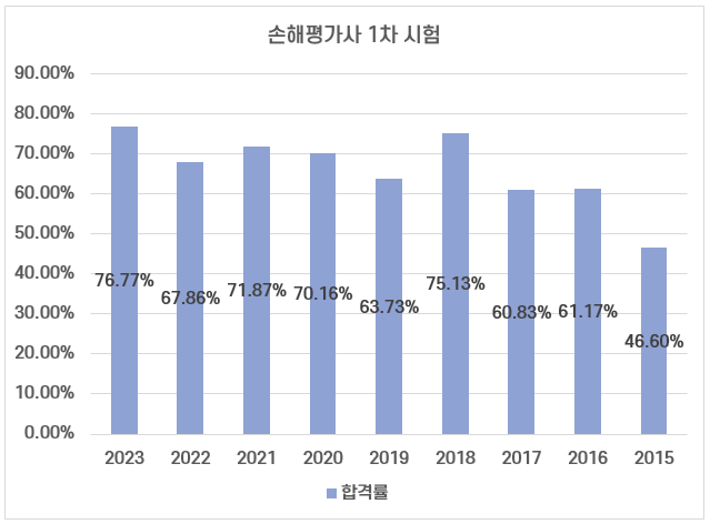 2015년 제1회부터 2023년 제9회까지 손해평가사 1차 시험 평균 합격률은 70%정도인데요. 2015년 합격률이 46.60%로 가장 낮았고, 2023년 합격률이 76.77%로 가장 높았습니다.