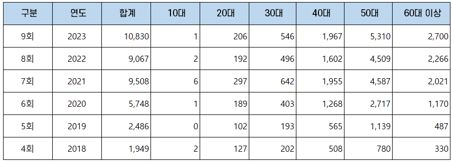 | 9회 | 2023 | 10,830 | 8,055 | 2,775 | 25.62% |