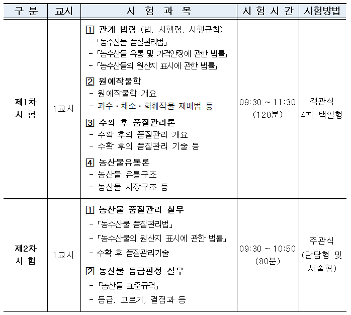 1교시 | ① 농산물 품질관리 실무 -「농수산물 품질관리법」 -「농수산물의 원산지 표시에 관한 법률」 - 수확 후 품질관리기술 ② 농산물 등급판정 실무 -「농산물 표준규격」 - 등급, 고르기, 결점과 등 |
