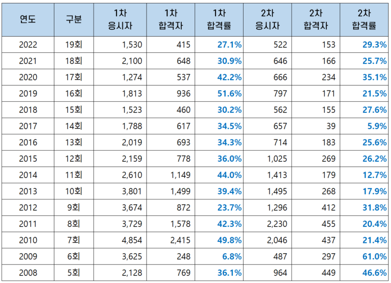 시험 난이도에 따라 2차 시험 합격률은5.9%에서 61.0% 사이의 분포를 보이고 있어 연도별 합격률 편차가 큰 편입니다.