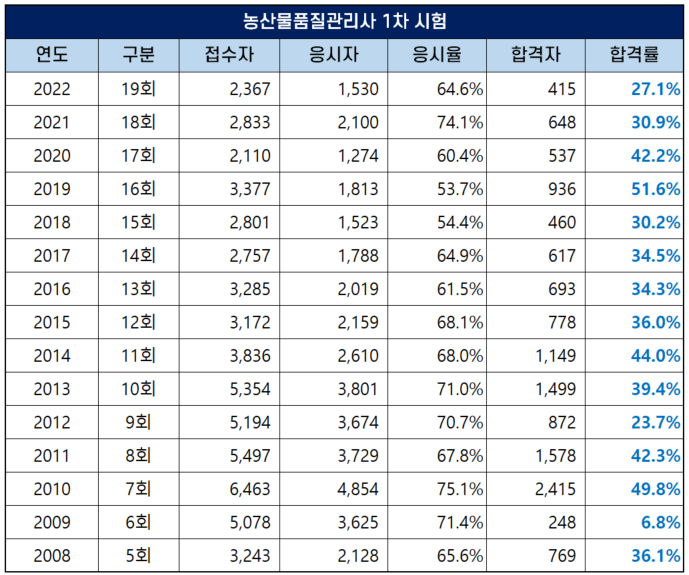 농산물품질관리사 1차 시험 응시율 및 합격률