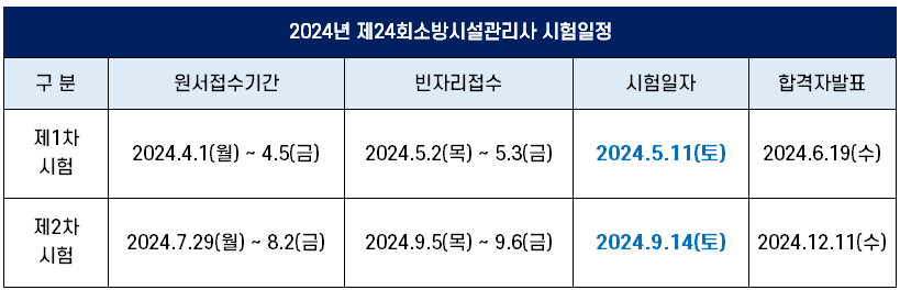 2024년 소방시설관리사 1차 시험과 2차 시험 일정은 다음과 같습니다.