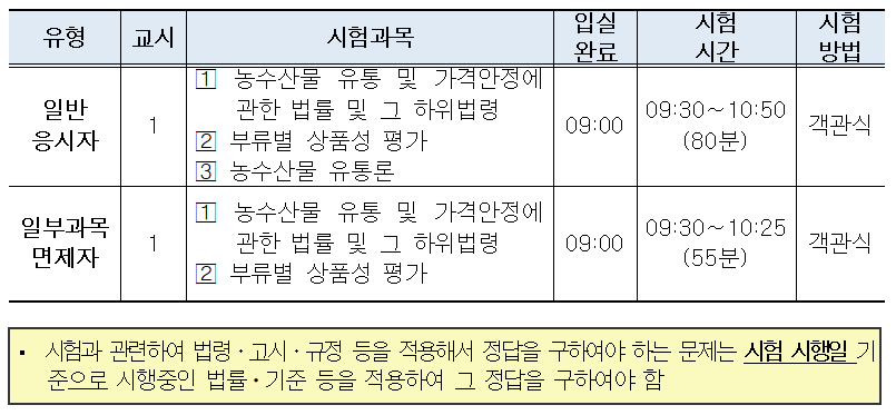 1 | 1. 농수산물 유통 및 가격안정에 관한 법률 및 그 하위법령 2. 부류별 상품성 평가 3. 농수산물 유통론 |