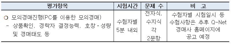 수험자별 5분 내외 | 전자식, 수지식 각 2문항 | 수험자별 시험일시 등 수험사항은 추후 Q-Net 경매사 홈페이지에 공고 예정 |