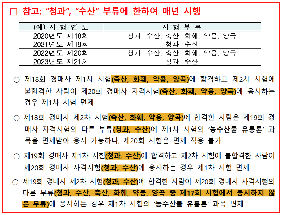 ❍ 제2차 시험에 합격한 사람이 다른 부류의 시험에 응시하는 경우에는 다음 회의 시험에 한정하여 제1차 시험의 농수산물유통론을 면제