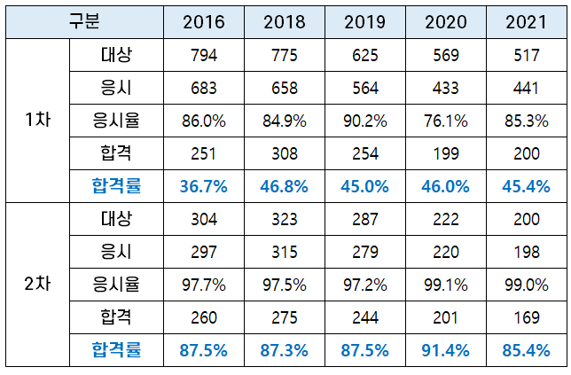 | 합격률 | 36.7% | 46.8% | 45.0% | 46.0% | 45.4% | |