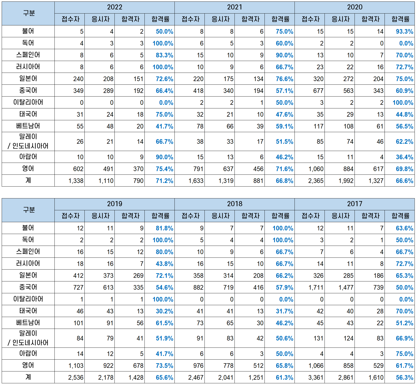 | 불어 | 9 | 7 | 7 | 100.0% |