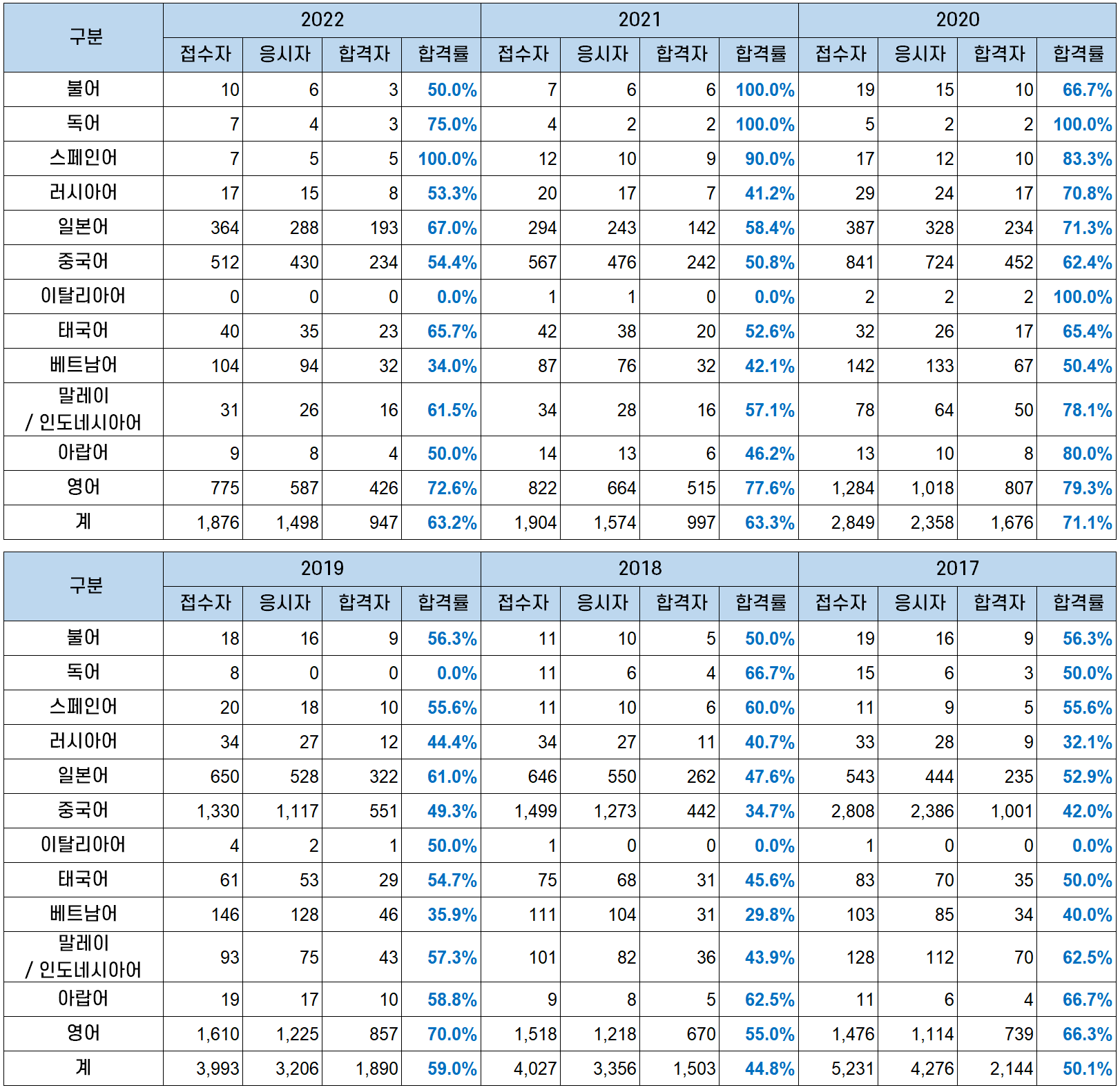 | 스페인어 | 7 | 5 | 5 | 100.0% |