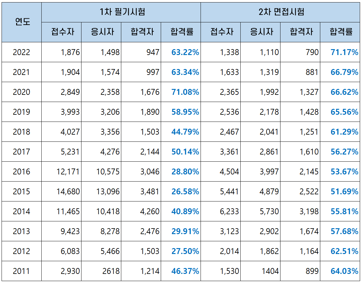 | 연도 | 접수자 | 응시자 | 합격자 | 합격률 |