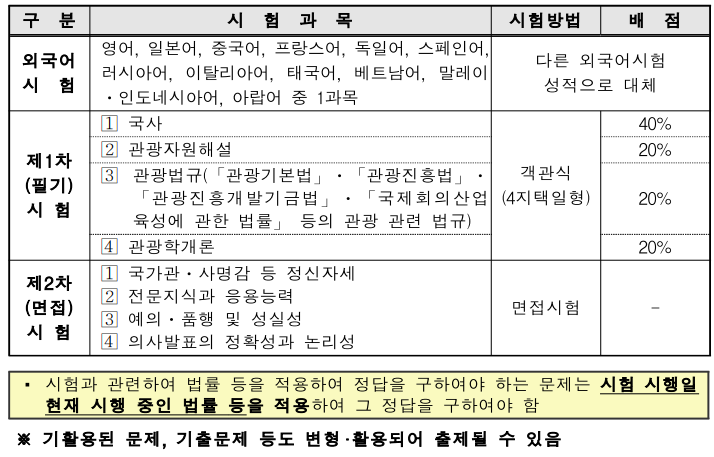| 필기시험 면제 | 관광통역안내사 자격증을 소지한 자가 다른 외국어 분야의 관광통역안내사 시험에 응시하는 자 |