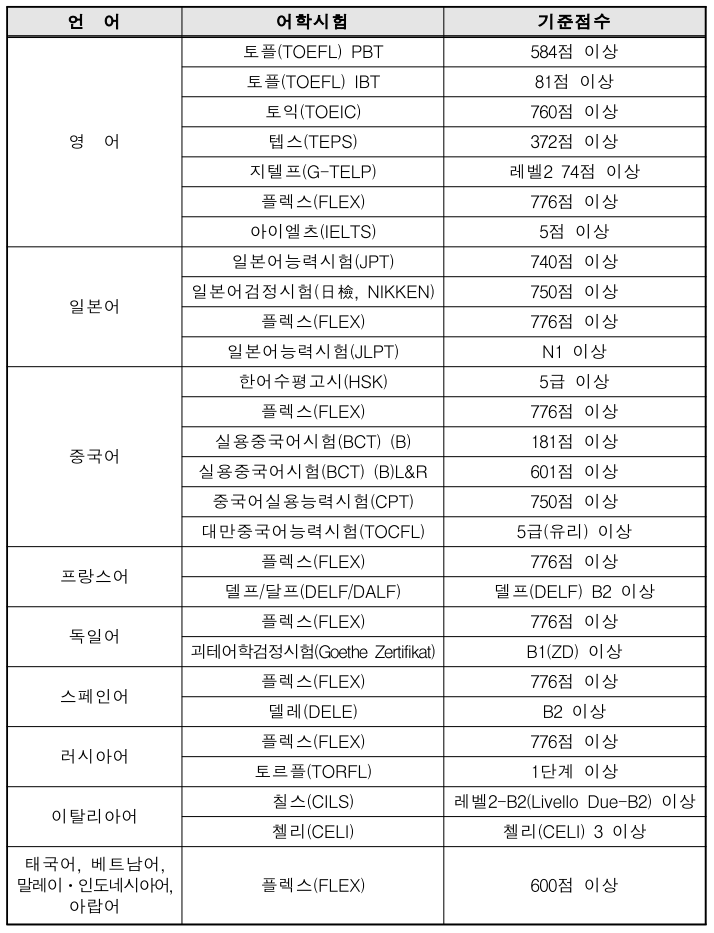 | 언 어 | 어학시험 | 기준점수 |