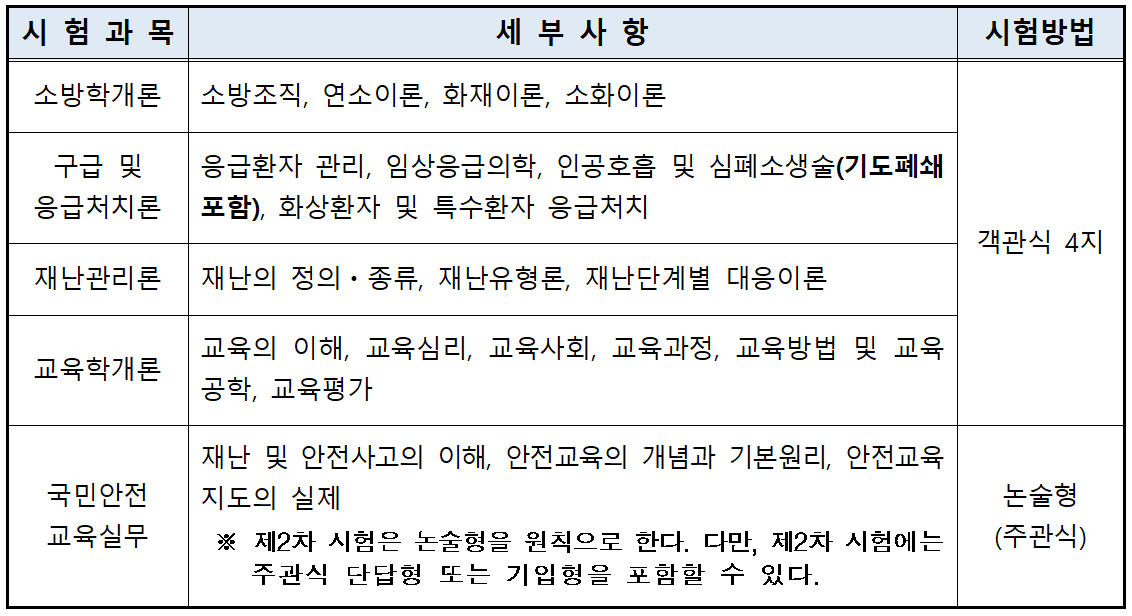 • 소방학개론 • 구급 및 응급처치론 • 재난관리론 • 교육학개론 (4과목 중 택3과목) |