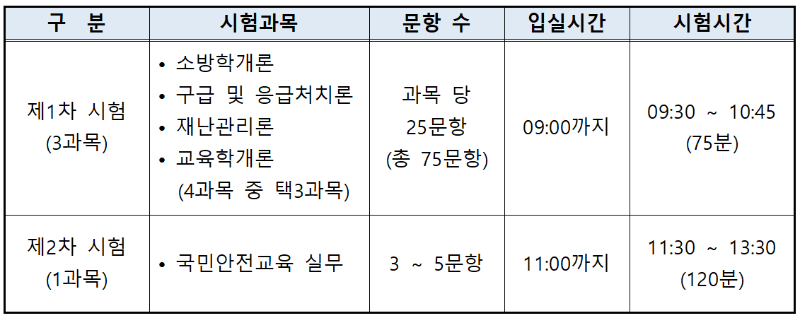 • 국민안전교육 실무 | 3 ∼ 5문항 | 11:00까지 | 11:30 ∼ 13:30 (120분) |