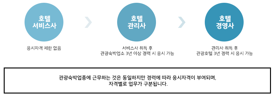 호텔 경영, 객실관리, 서비스관리, 고객 및 접대관리, 음식관리 등 호텔 투숙객을 위하여 호텔에서 진행하는 모든 서비스를 담당하는 호텔리어 자격증은 관광진흥법에 따라 호텔서비스사, 호텔관리사, 호텔경영사 자격으로 구분