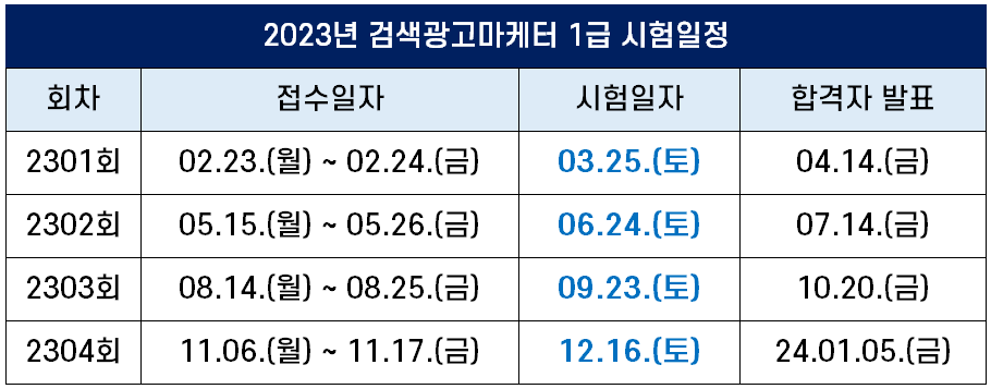 2023년 시행되는 검색광고마케터 시험일, 원서접수기간, 합격자 발표일 등 시험 일정은 다음과 같습니다.
