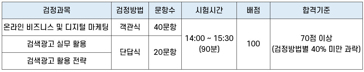 | 온라인 비즈니스 및 디지털 마케팅 | 객관식 | 40문항 | 90분 | 100 | 70점 이상 (검정방법별40%미만과락) |