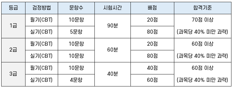 | 3급 | 필기(CBT) | 10문항 | 40분 | 40점 | 60점 이상 |