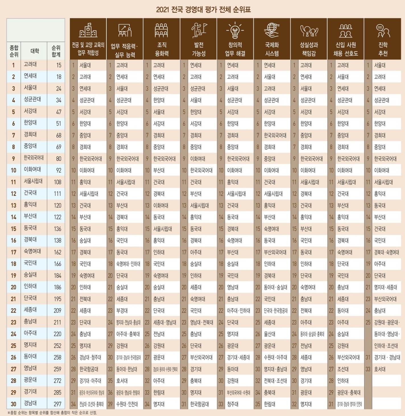 2021년 전국 경영대 부문별 순위 TOP 10