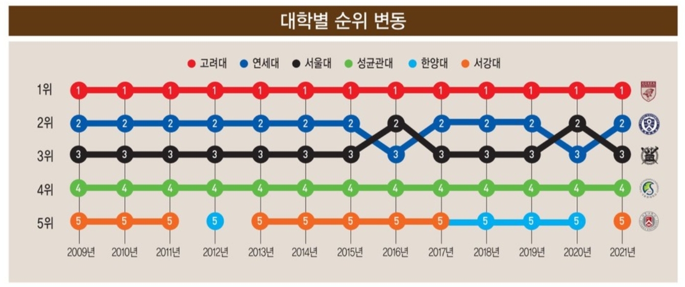 매년 전국 경영대 평가는 고려대, 연세대, 서울대, 성균관대, 서강대, 한양대 등 6개 대학이 종합 순위 TOP 1~5위 자리를 놓고 각축을 벌이고 있습니다.