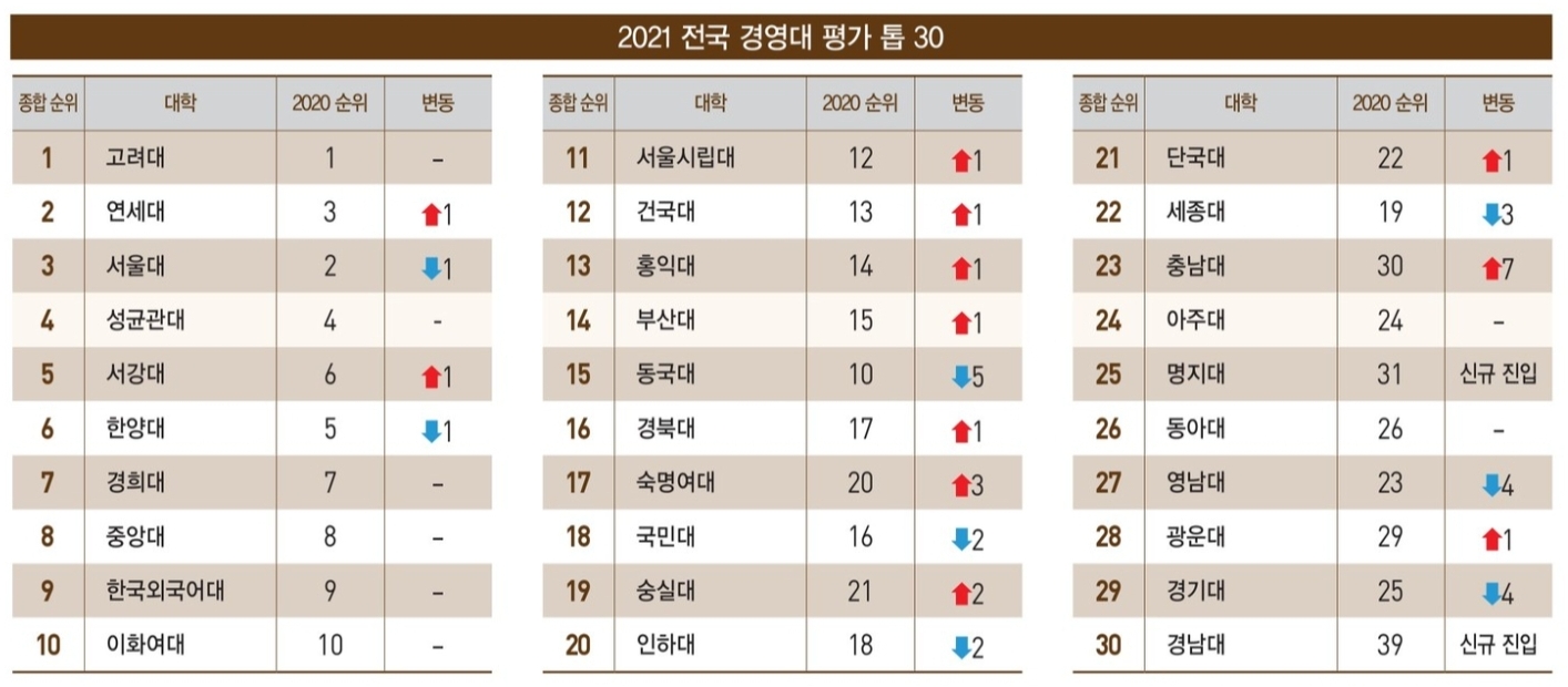 2021년 경영대 평가에서는 고려대가 1위, 연세대가 2위, 서울대가 3위를 차지했습니다. 2021년 전국 경영대 순위 TOP30에 오른 경영학과 대학은 아래 표와 같습니다.