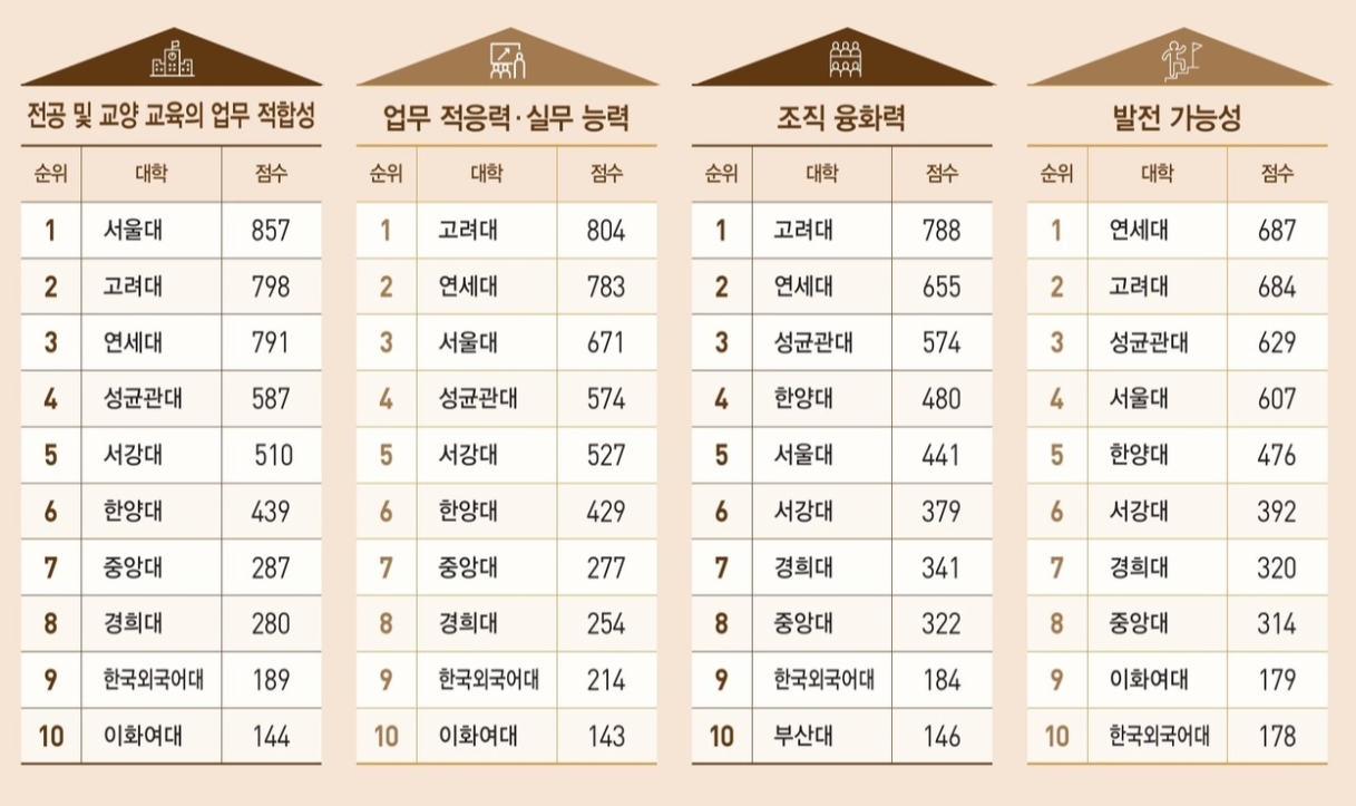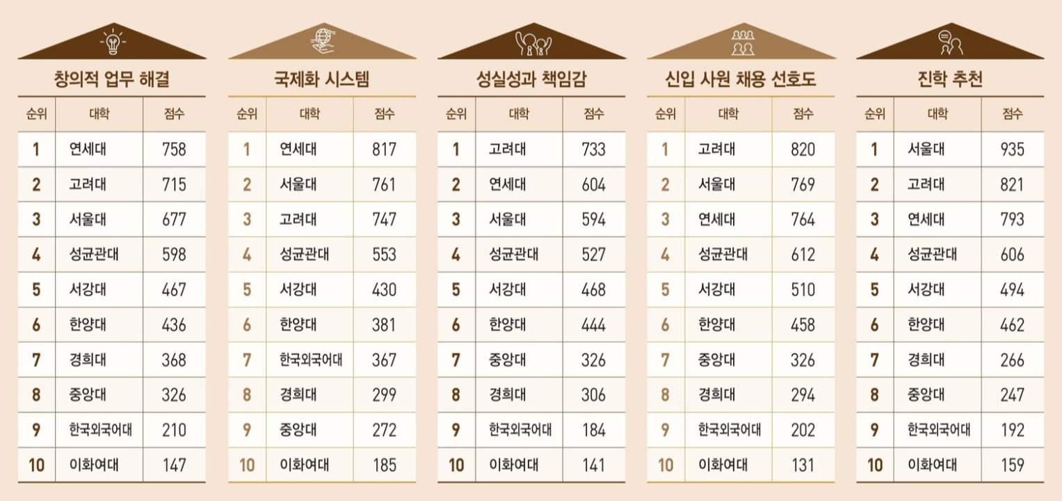 고려대는 처음 전국 경영대 평가를 시작한 2008년부터 14년 연속으로 전국 경영대 순위 1위에 올라 명실상부한 최고 대학으로 자리매김했습니다. 고려대는 9개 부문 중 4개(업무 적응력·실무 능력, 조직 융화력, 성실성과 책임감, 신입사원 채용 선호도) 부문에서 1위를 차지했습니다.