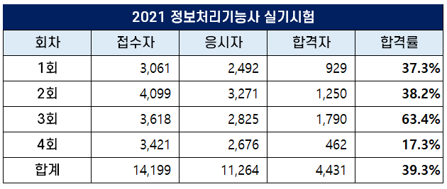 4회 정보처리기능사 실기 합격률이 크게 낮아지면서 2021년 1~4회 평균 실기 합격률은 39.3%를 기록해 역대 평균 합격률인 41.5%보다 낮았습니다.