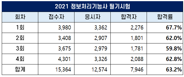 2021년 정보처리기능사 필기 합격률