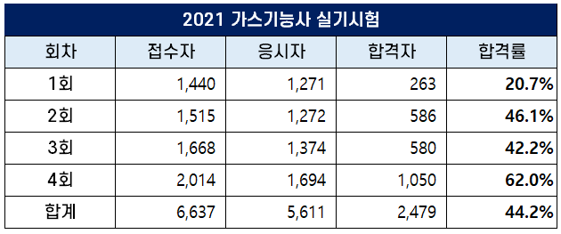 2021년 1~4회 가스기능사 실기 합격률