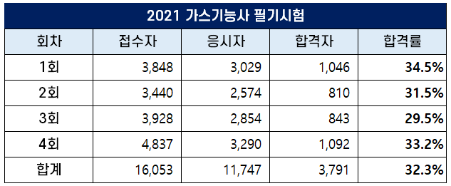 2021년 가스기능사 1회 필기시험 합격률은 34.5%, 2회 합격률은 31.5%, 3회 합격률은 29.5%, 4회 합격률은 33.2%를 기록하여 2021년 평균 가스기능사 필기 합격률은 32.3%입니다.