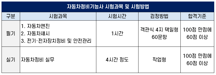 | 실기 | 자동차정비 실무 | 4시간 정도 | 작업형 | 100점 만점에 60점 이상 |